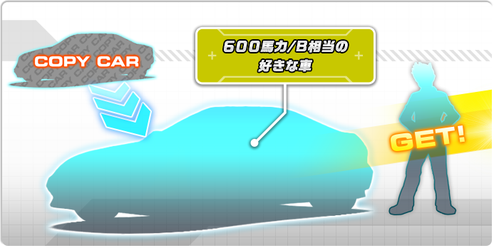 | 600馬力/B相当の好きな車 | 友達(誘われる側)がコピー車で5回プレイ後に、コピー車が無くなる代わりに作れます この車を使用すると、ストーリーモードを第21話から 始めることができます (1話~20話もプレイできます) |
