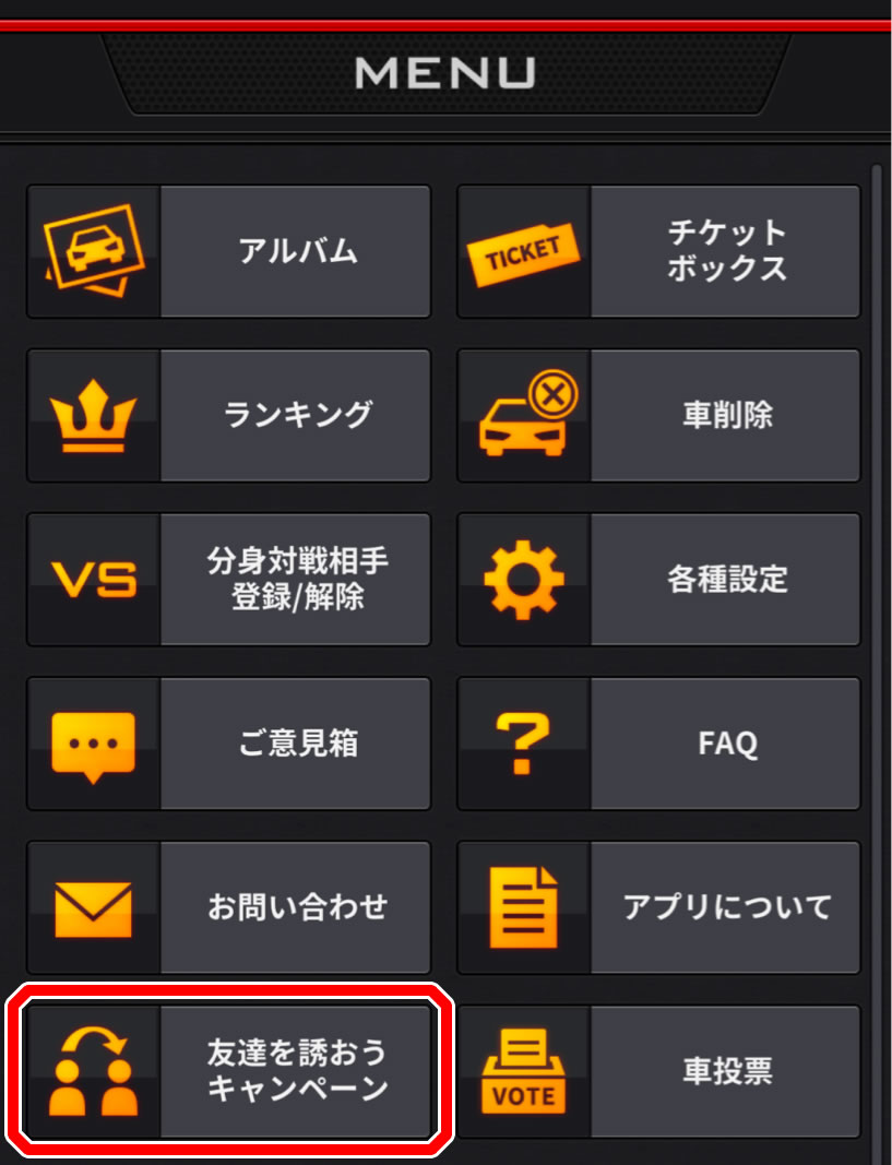 A.「フルチューン車作成チケットが発行されています」と出ている段階では、まだチケットは獲得していません。まず、アプリ湾岸ナビゲーターの「友達を誘おうキャンペーン」メニューをご確認下さい。