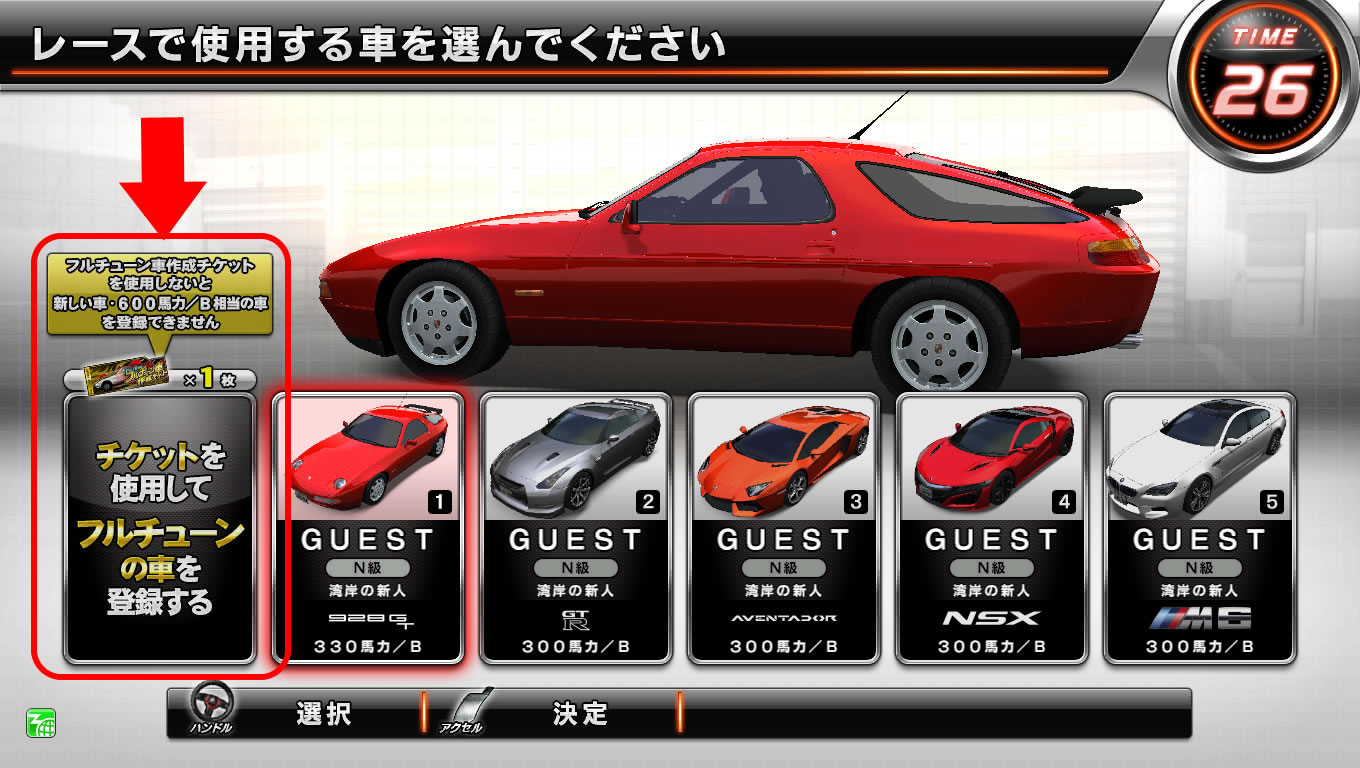 | フルチューン車作成チケット | フルチューン(840馬力/DG相当)の好きな車を1台作成できます 下記の条件を満たした後に、湾岸ナビゲーターでもらえます |