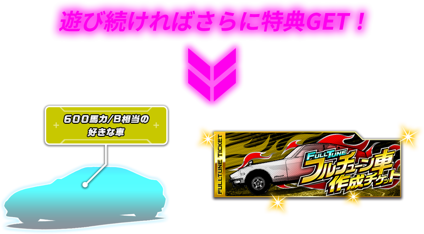 Q.ゲーム機(ドライブマシン)で「フルチューン車作成チケットが発行されています」と出ていますが、フルチューン車作成チケットはどこでもえらえるのでしょうか?